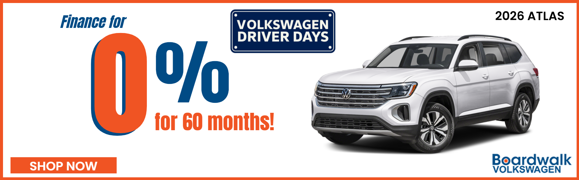 0% APR, no down payment required. Available on new, unused 2026 Atlas models (excludes Atlas Cross Sport) financed by Wells Fargo through participating dealers. Example: For 0% APR, monthly payment for every $1,000 you finance for 60 months is $16.67. Not all customers will qualify for credit approval or advertised APR. Subject to credit approval by Wells Fargo. Offer ends April 30, 2026. Offer not valid in Puerto Rico. See your participating Volkswagen dealer for details or, for general product information, call 1-800-Drive-VW. ©2026 Volkswagen of America, Inc